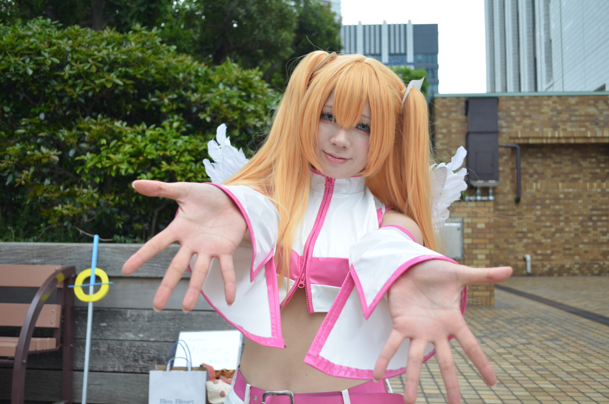 自然光とコスチュームの白・ピンクのコントラストが絶妙で、天使のような雰囲気を際立たせています。