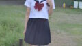花壇を背景にふんわりと広がるスカートが視線を奪う全身構図。