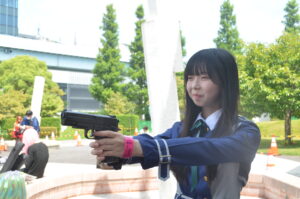 銃を構える腕に力強さがありながらも、表情はどこか柔らかい。