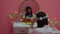 同じく椅子に座っているシーンですが、やや上目遣いの表情が印象的です。