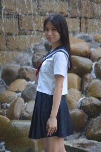 セーラー服ならではの清楚感を活かしつつ、滝の涼やかな背景が彼女の爽やかさをより一層引き立てています。