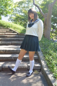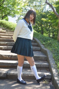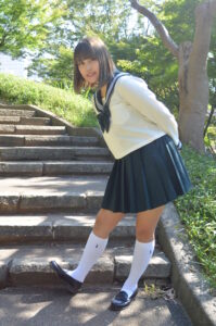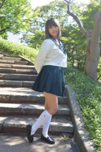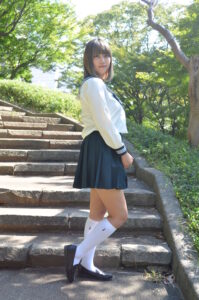 自然光を活かし、背景の緑や階段のテクスチャを取り入れると、制服姿の魅力を一層引き立てられます。