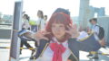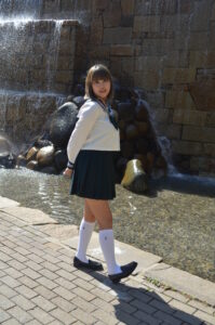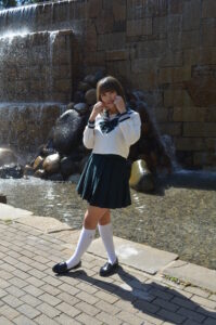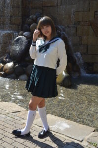 腕を少し上げた可愛らしい仕草が、まるで制服姿のキャラクターが動き出したような“役としての存在感”を生み出します。