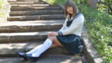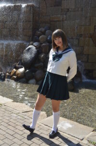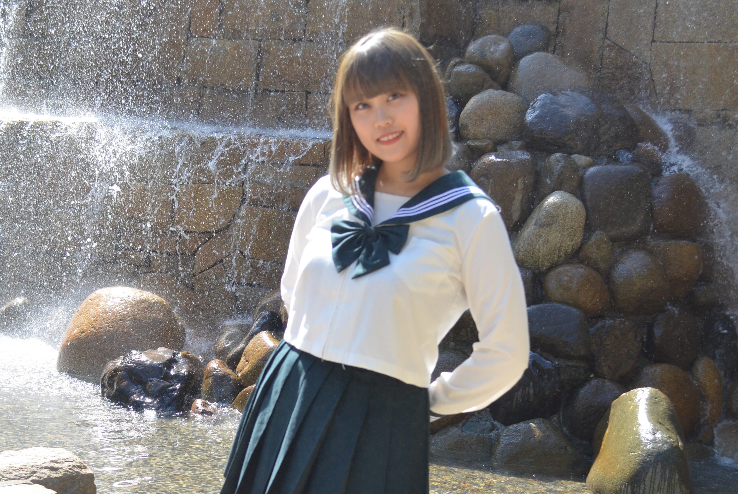 滝の前に立つ姿を正面から切り取ったこの一枚は、「制服×自然」の王道が持つ清涼感を最大限に引き出したシーン。
