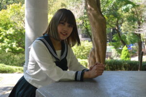 少し大人びた落ち着いた表情が、制服×自然という王道シーンをより深く印象づける。