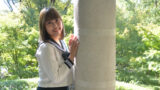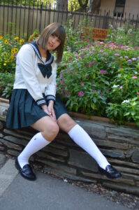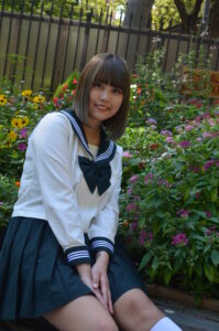 花壇を背景に姿勢を正して座ることで、凛とした“制服の象徴美”が伝わるカット。