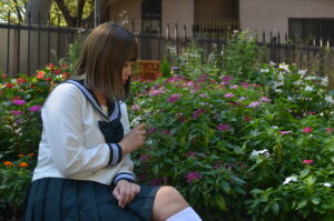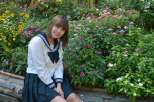 制服は清涼感と青春らしい物語性を強く持つ衣装なので、花壇の柔らかさと非常に相性が良いロケーション。