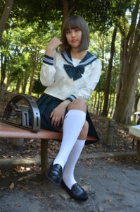 読者が求める「少し大人っぽい制服写真」を作る際に最適な構図で、撮影時は姿勢の角度や足先の向きまで微調整して“魅せるライン”を作り込みます。