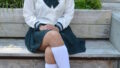 足を揃えようとして座った整った姿勢は、清楚感と端正さが際立つ構図。