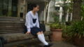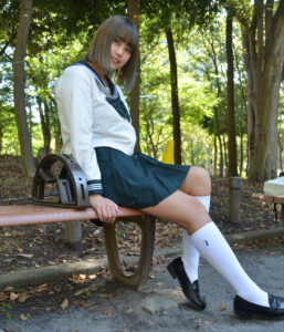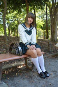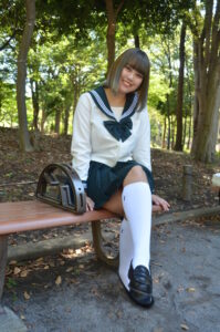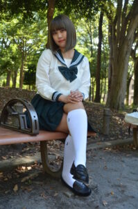 読者が求める「少し大人っぽい制服写真」を作る際に最適な構図で、撮影時は姿勢の角度や足先の向きまで微調整して“魅せるライン”を作り込みます。