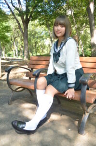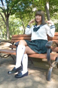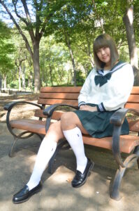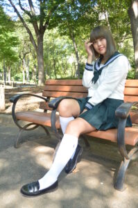 ベンチという“くつろぎの場所”と相性がよく、制服の持つ清楚さをより引き立てています。