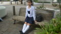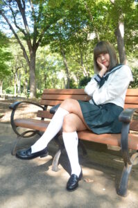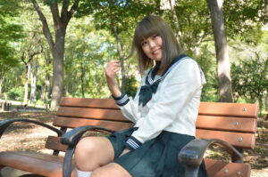 ベンチという“くつろぎの場所”と相性がよく、制服の持つ清楚さをより引き立てています。