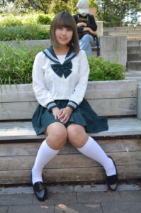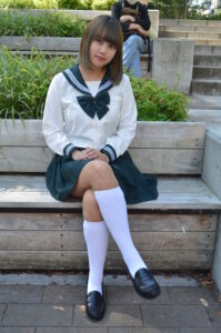 脚を伸ばしてリラックスしたポーズが、制服姿の親しみやすさを演出。