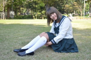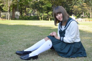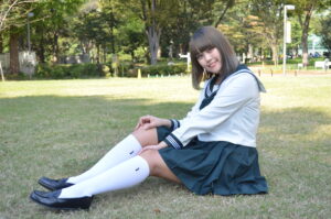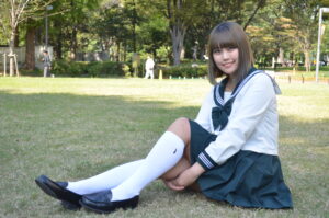 自然光の中で制服の白が映え、モデルさんの素朴な表情が「学校帰りのふとした一瞬」を連想させます。