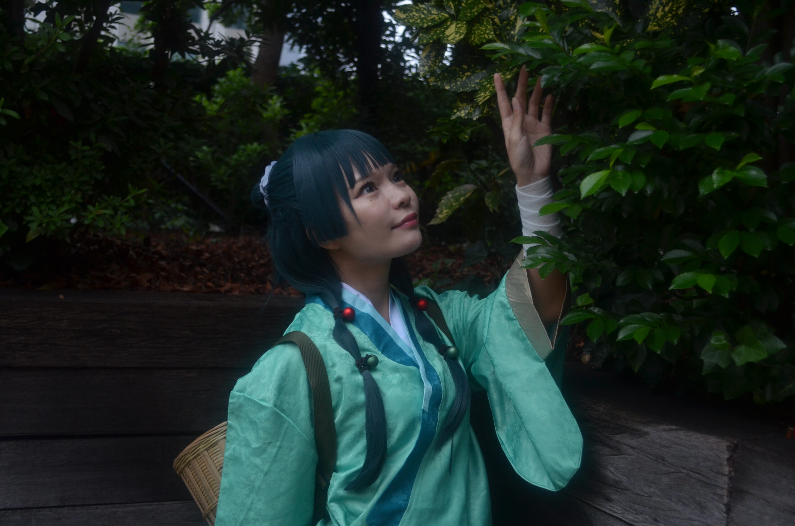 片手を軽く掲げ、もう片方の手で籠を支える姿は、薬草を探す猫猫の姿を彷彿とさせます。