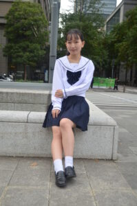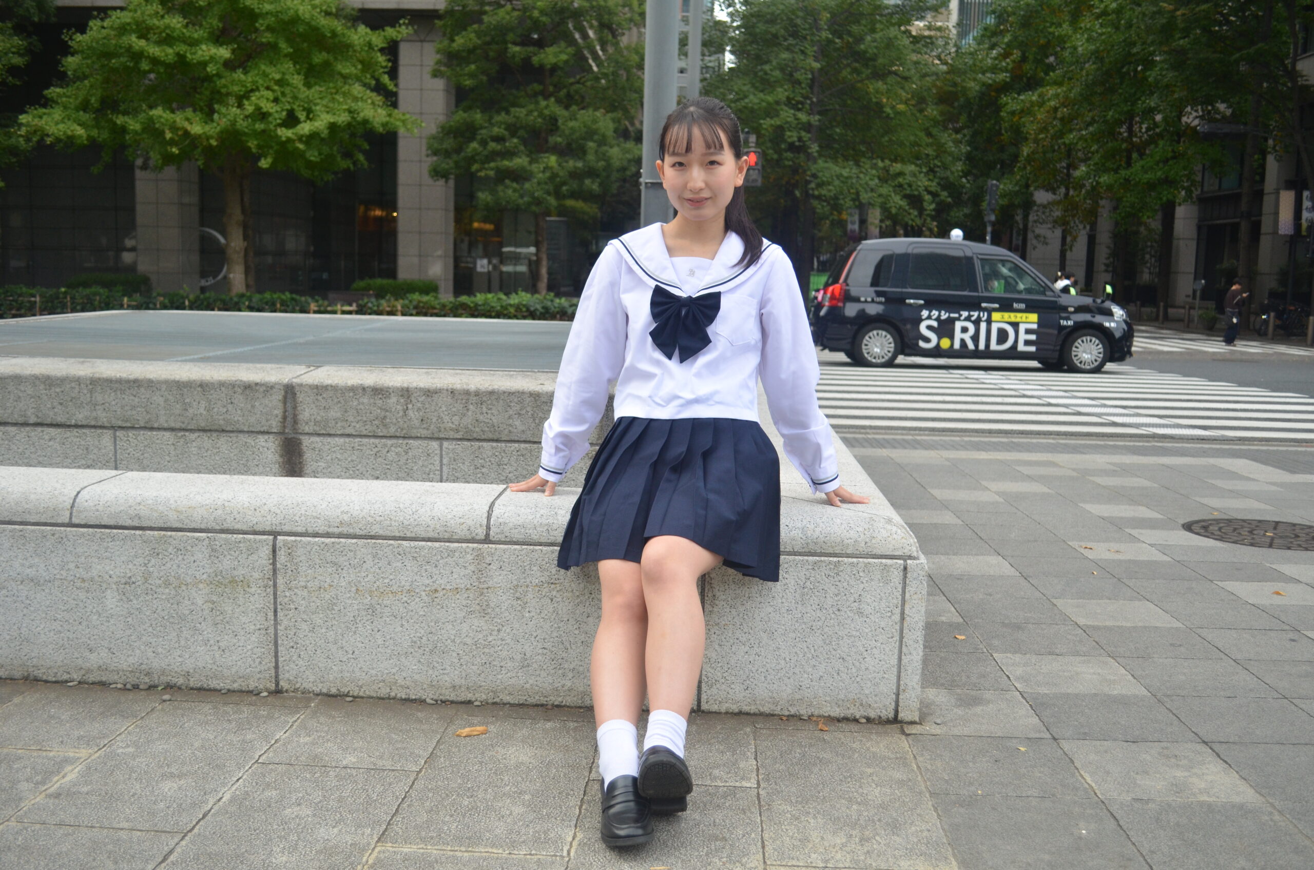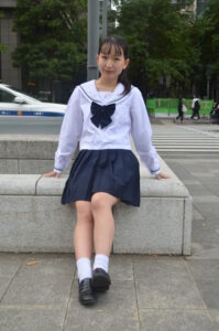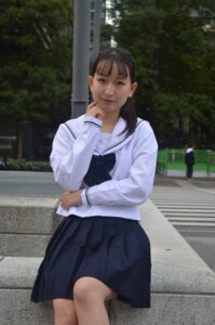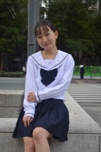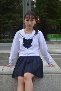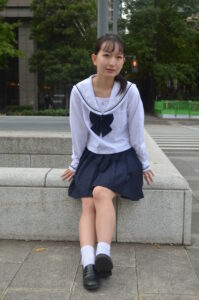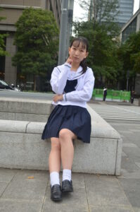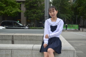都会の石段にちょこんと座る姿が、セーラー服の清楚さと街の無機質さを柔らかく溶け合わせています。