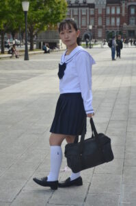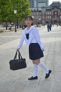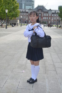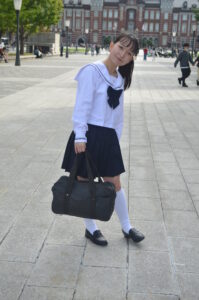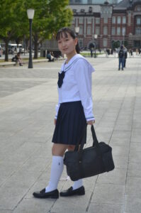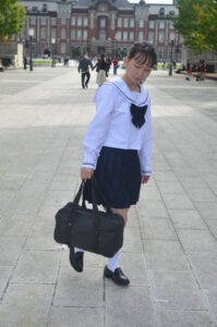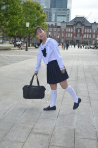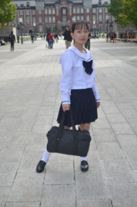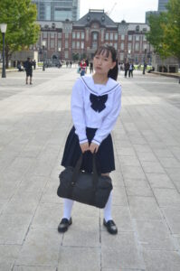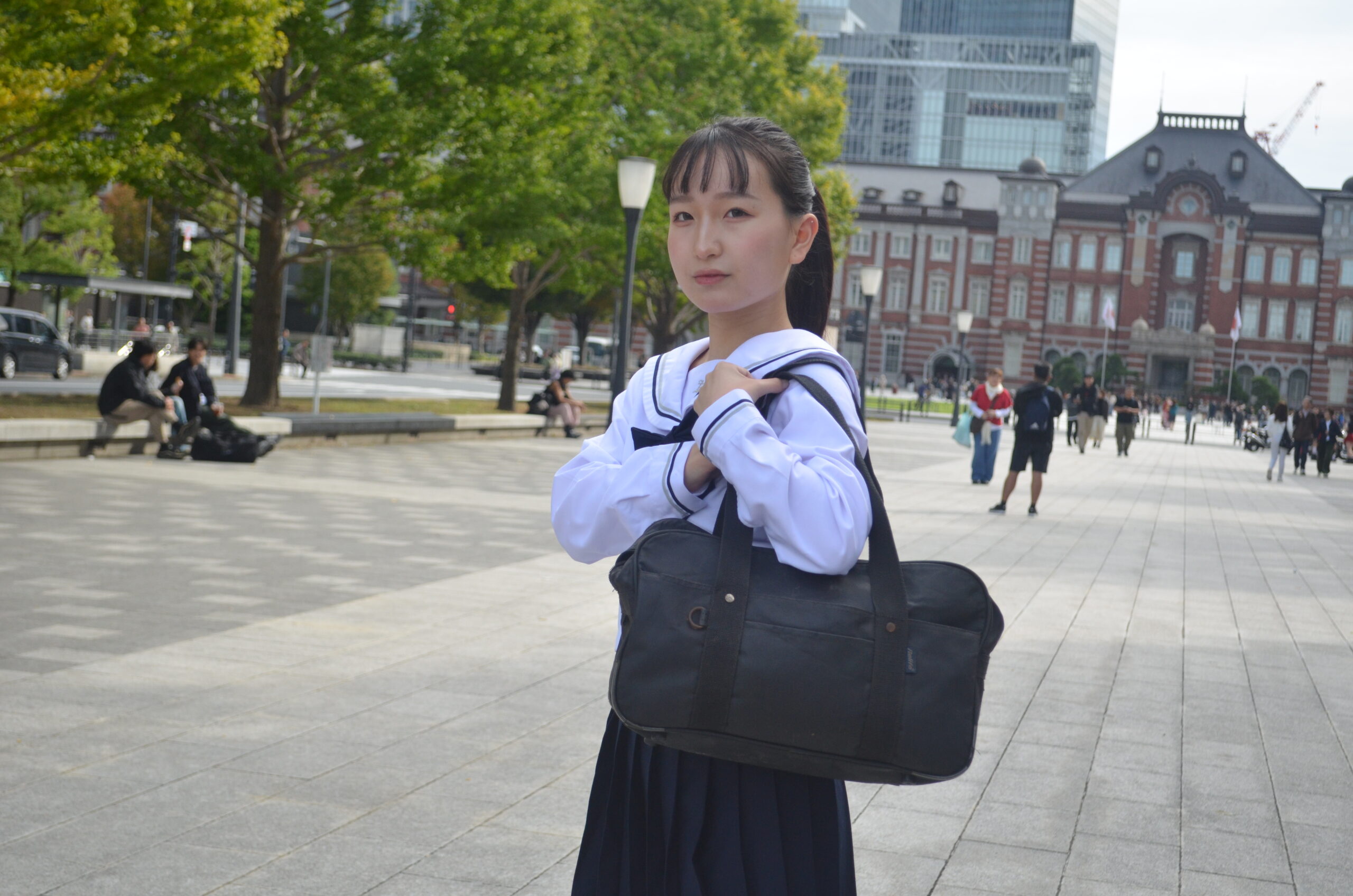 制服・スクバ・東京駅という三要素が最も調和し、ポートレートとして完成度の高い1枚です。