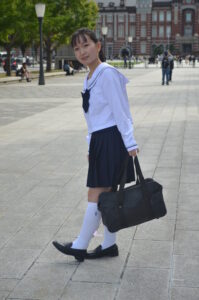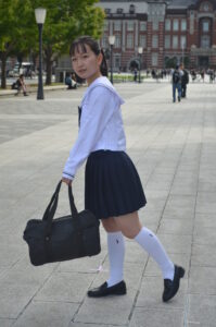 スクバの位置を低めにすることで脚のラインが綺麗に出て、爽やかな学生らしさが強調されます。
