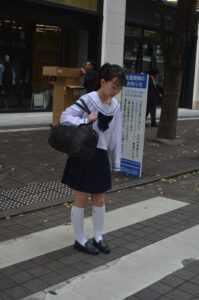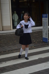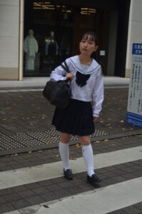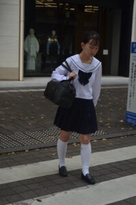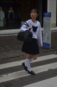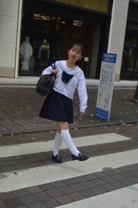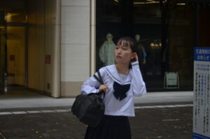視線を足元へ落とすことで、通学途中の“ふとした間(ま)”が生まれ、写真に静かなドラマが流れます。