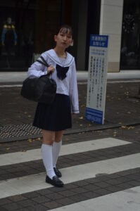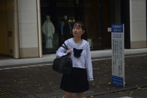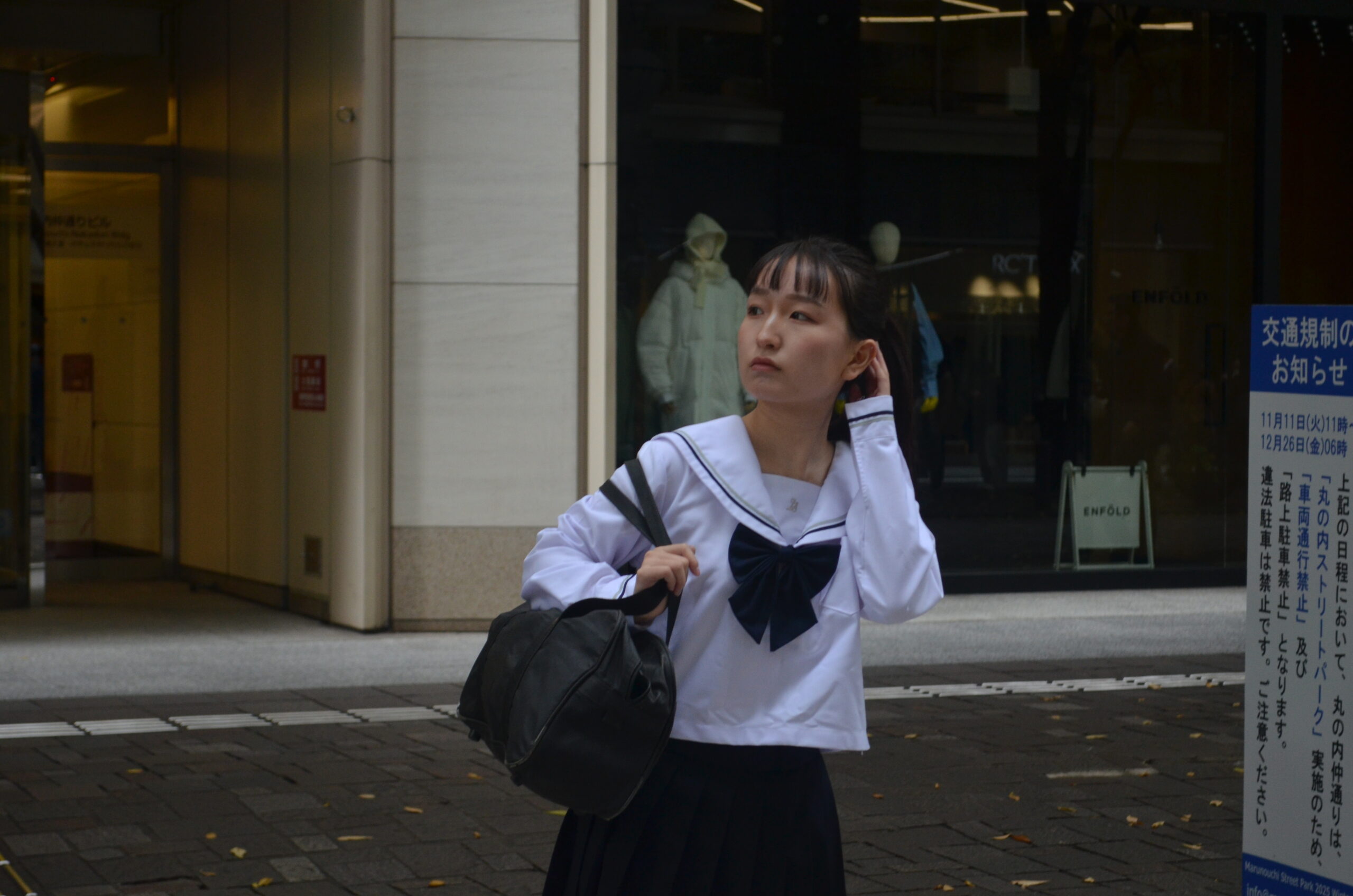 丸の内の空気感とセーラー服の清楚感が重なり、歩行の一瞬が映画のワンシーンのように立ち上がります。