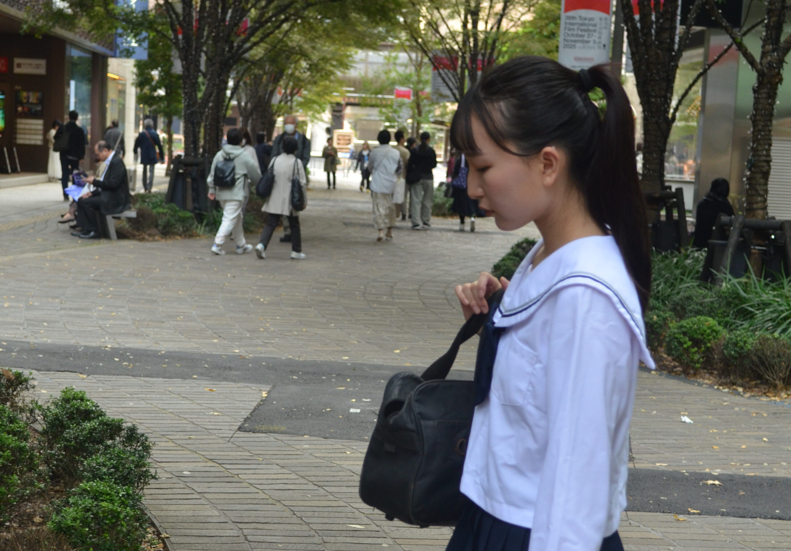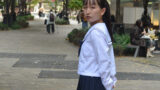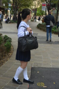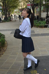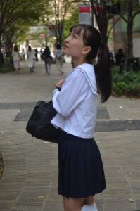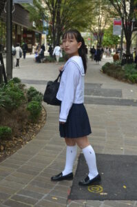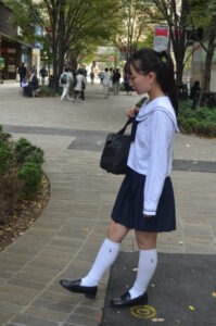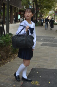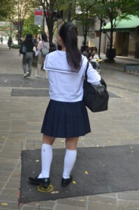 セーラー服のシルエットとスカートの動き、足元のリズム感が被写体の若さと軽やかさを際立たせている。