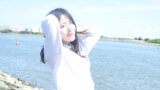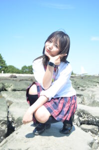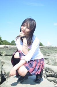 磯浜のざらついた質感と、モデルさんのあどけない仕草の対比が「夏休みの放課後に友達と寄り道した瞬間」を想起させます。