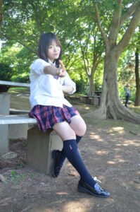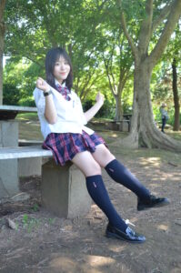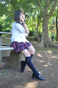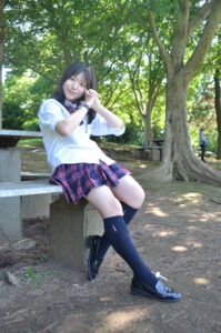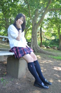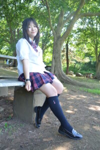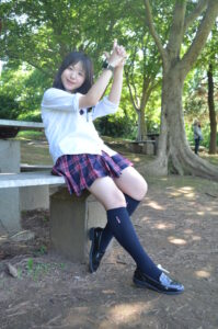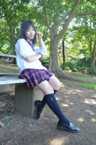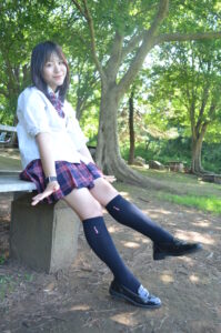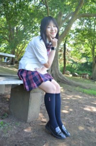 足を軽く投げ出し、上体を少しだけ傾けたポーズは、制服姿の無防備さと大人びた雰囲気が同居する瞬間です。