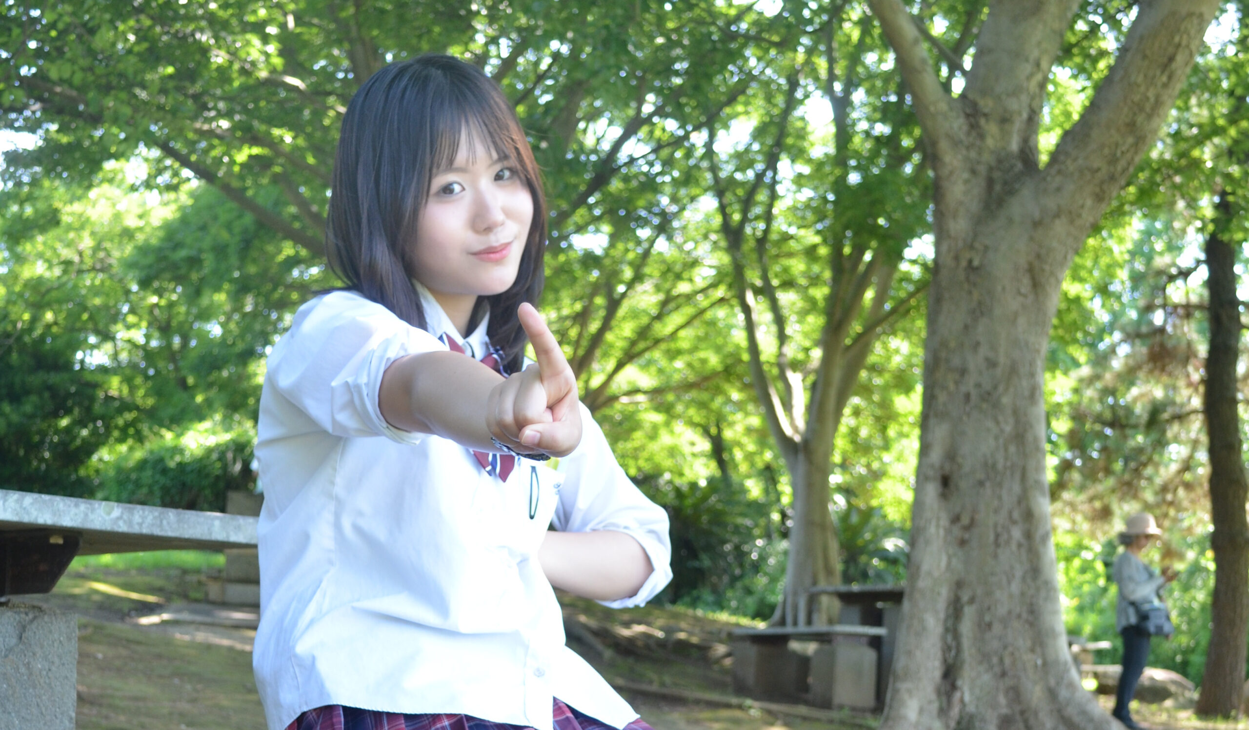 制服ポートレートでは「静」と「動」のバランスが重要で、このカットでは動きを取り入れることで写真全体にストーリー性を持たせています。