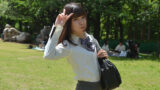 制服姿のあどけなさと、晴れた芝生の開放感が絶妙にマッチしています。