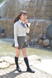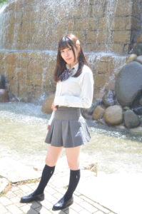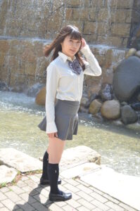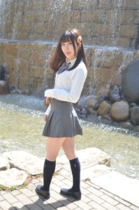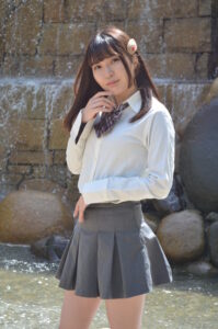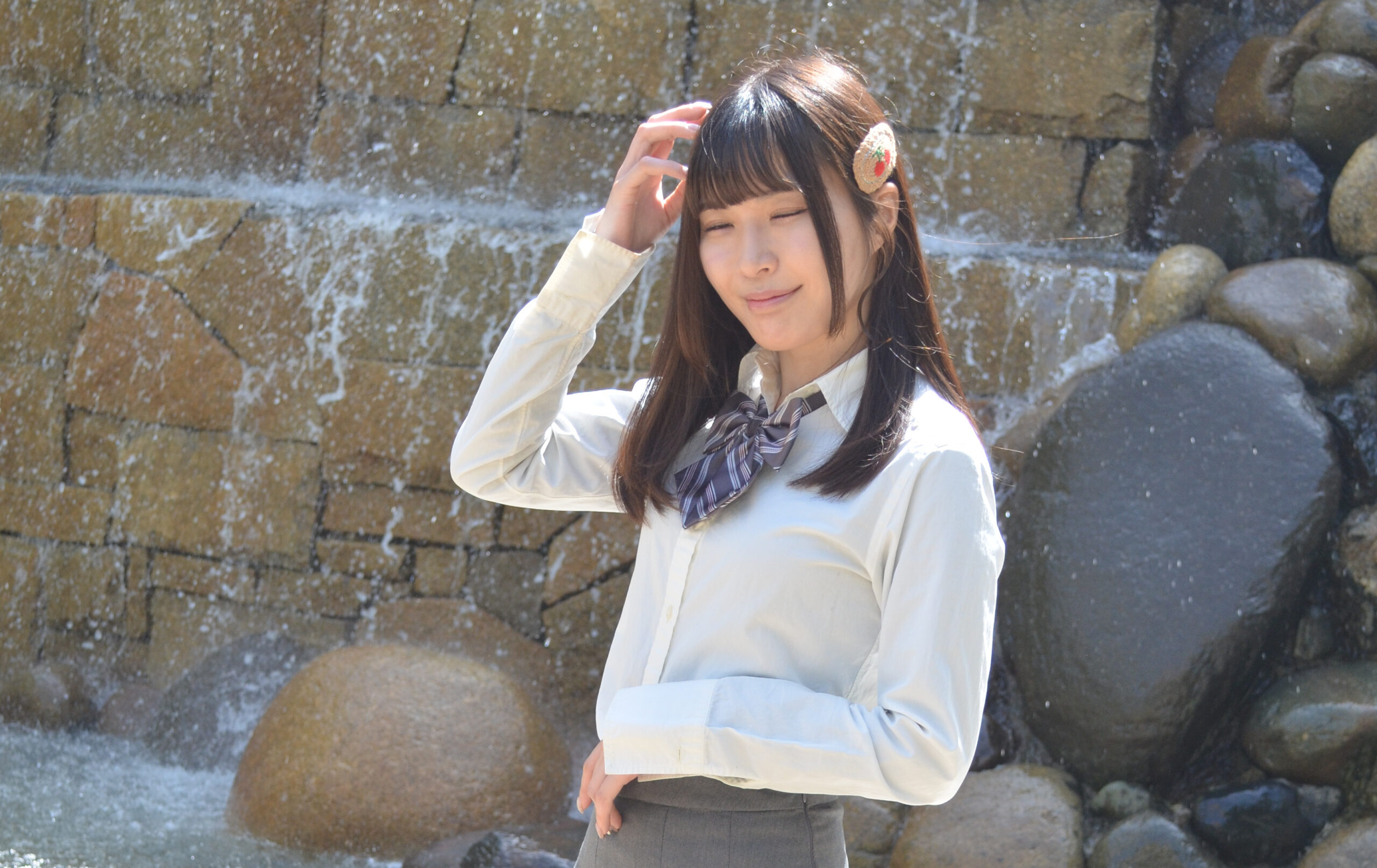 滝と石の背景がナチュラルな雰囲気を作り、制服の清楚感と調和しています。