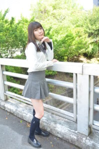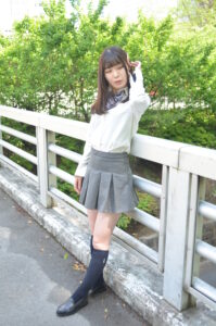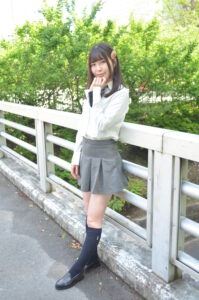 制服姿の持つ“純真さ”を最大限に引き出しながら、表情で親しみやすさも演出しています。