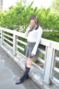 制服姿の持つ“純真さ”を最大限に引き出しながら、表情で親しみやすさも演出しています。