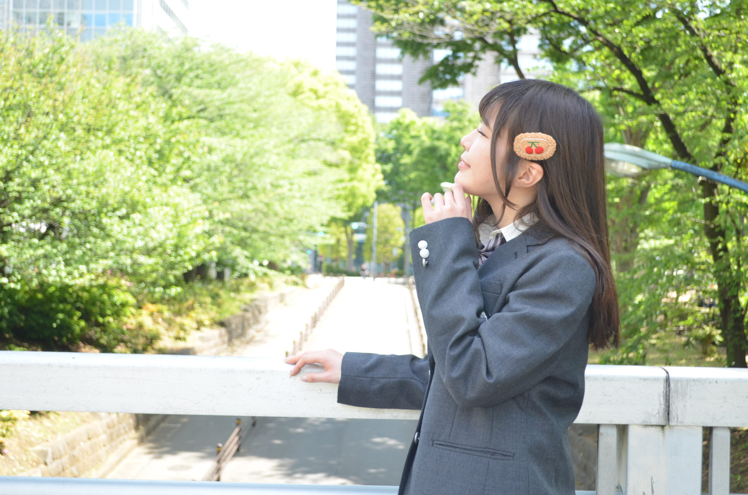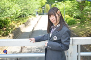 少し微笑む表情に、制服の爽やかさと橋の自然背景が相まって、親しみやすくも清楚な印象を与えます。