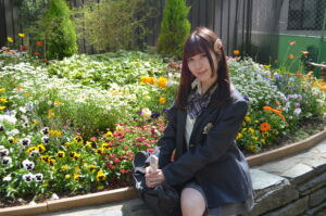 柔らかい笑顔と自然な体の傾きが印象的な1枚。花壇のカラフルな彩りと制服姿の清楚な雰囲気が見事に調和しています。