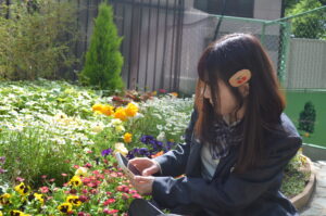 風に髪がなびく瞬間を切り取ったような一枚で、花壇とのコントラストが詩的です。