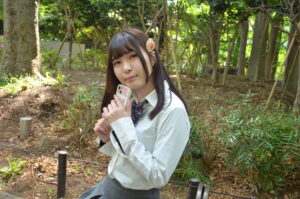 制服姿と背景の木々が柔らかく調和し、清楚感とナチュラルさを感じさせます。