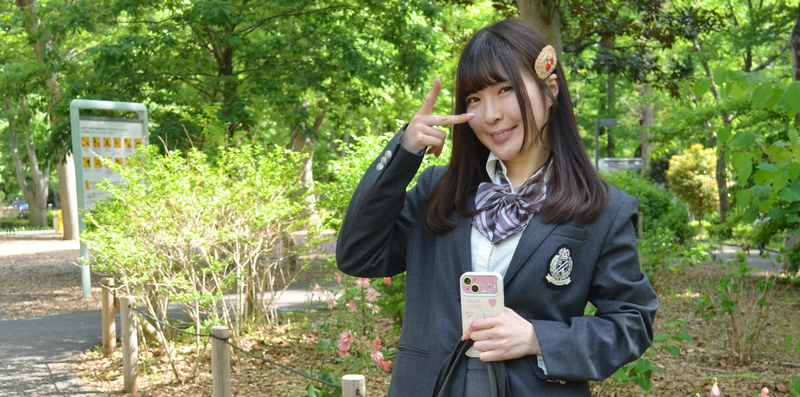 小路の木漏れ日と制服の黒が、彼女の存在感を一層引き立てています。