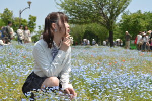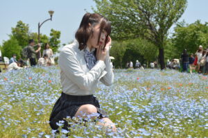 ネモフィラを単なる背景ではなく、“感情を映す対象”として扱うことで写真に奥行きを与えています。