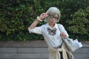 眼鏡に手をかける仕草が知的さを演出しつつも、少し小首を傾げたポーズがギャル感とツンデレ気質を絶妙に両立。